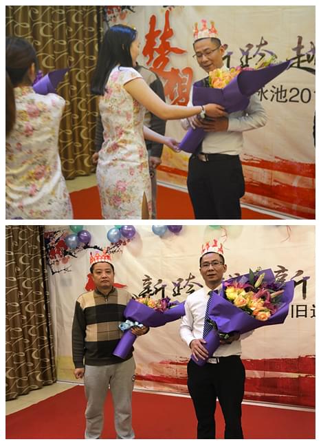 美酒、佳肴,大家紛紛舉杯敬我們的兩位大家長,過去的一年,感謝有曹總和周總的帶領(lǐng),沒有您們的慷慨奉獻,哪有我們收獲的今天。戴高樂家人們都拿到了豐厚的禮物當然也少不了曹總和周總的禮物啦!我們工廠廠長潘偉勝和外貿(mào)部鏗鏘玫瑰的小美女陳桂嬋代表所有的戴高樂家人給曹總和周總送上禮物!