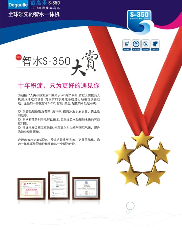 水是孕育一切生命的源泉,逐水而居,親水、樂水,是人類始終不渝的追求。古有“智者樂山,仁者樂水”的生活理想,今有“戴高樂S-350智水一體化系統(tǒng)”的夢(mèng)想達(dá)成。戴高樂S-350智水一體化系統(tǒng),不僅滿足泳池的傳統(tǒng)需求,新增的鹽水理療功效,更是對(duì)現(xiàn)代化健康生活的完美詮釋。有泳池的地方就有無限生活意境,有戴高樂S-350智水一體化系統(tǒng)的地方就有無限的智水理念!