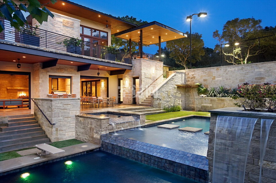 初看上去,水景園泳池與自然主義風(fēng)格的泳池非常類似,但實(shí)際上它們差別很大。水景園泳池有更為豐富的內(nèi)容。水景園泳池好像有中國(guó)園林的精髓,設(shè)計(jì)精心、富有變化,往往有水滑梯、噴泉、瀑布、人工洞穴甚至沙灘造景。水景園泳池使得整個(gè)庭院更像美麗的自然主義園林,因此它比僅是自然主義的泳池造價(jià)要高得多,維護(hù)費(fèi)用也更高。不言而喻,擁有水景園泳池的別墅也擁有令人咋舌的價(jià)格。如果泳池和別墅搭配適宜,很多水景園泳池的夜景甚至比白天的景觀更為美麗。