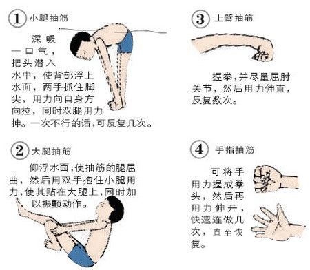 手臂抽筋:將手握成拳頭并盡量曲肘,然后再用力伸開如此反復(fù)數(shù)次。